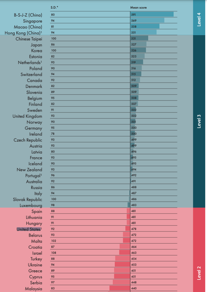 Just consider the PISA global education rankings. USA lags significantly behind Canada in all 3 areas of Reading, Science, and Math, and very far behind world leaders like Singapore and Estonia. Particularly in Math (shown above), American students lag far behind every single developed nation, and are on par with countries like Belarus and Croatia.